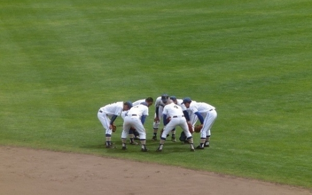 試合再開前に、守る方のチームの人達は外野の芝生で円陣を組みます。整備したグラウンドを綺麗な状態で試合を開催するためなんですね。